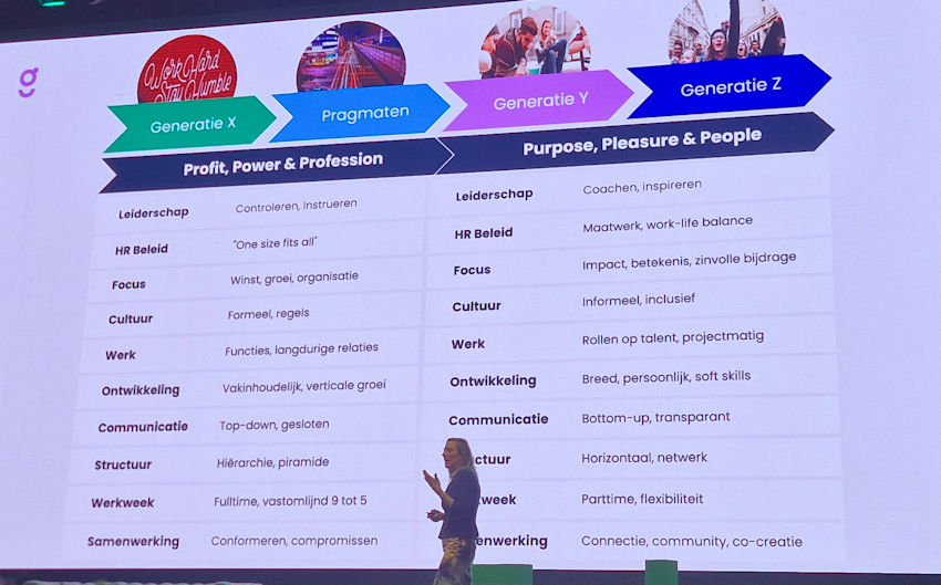 “Vooral in de houding t.o.v. ‘werk’ is er een groot verschil tussen generaties. Dat leidt nog wel eens tot onbegrip en frustraties.” Kim Jansen wees er op dat je de verschillende grondhoudingen juist ook kunt inzetten om het team juist te versterken. “Generatie X heeft een sterk gevoel voor werkethos. Voor de jongere generaties is de balans tussen werk en vrije tijd vaak van groter belang. De jongste generatie heeft bijvoorbeeld veel meer oog voor de rol van hun activiteiten voor de wereld van de toekomst.”