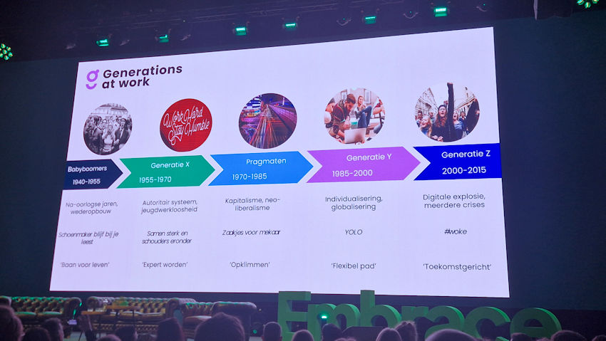 Tijdens de kennisdag van Booking Experts, Embrace, gaf sociaal psycholoog Kim Jansen een presentatie met inspirerende inzichten over generatiemanagement. Een belangrijke algemene conclusie: “De jongere generatie zorgt voor nieuwe impulsen, maar heeft daarbij de steun en ervaring van de oudere generaties nodig. Juist door het samenstellen van een team met meerdere generaties kun je effectief vooruitgang boeken.“
