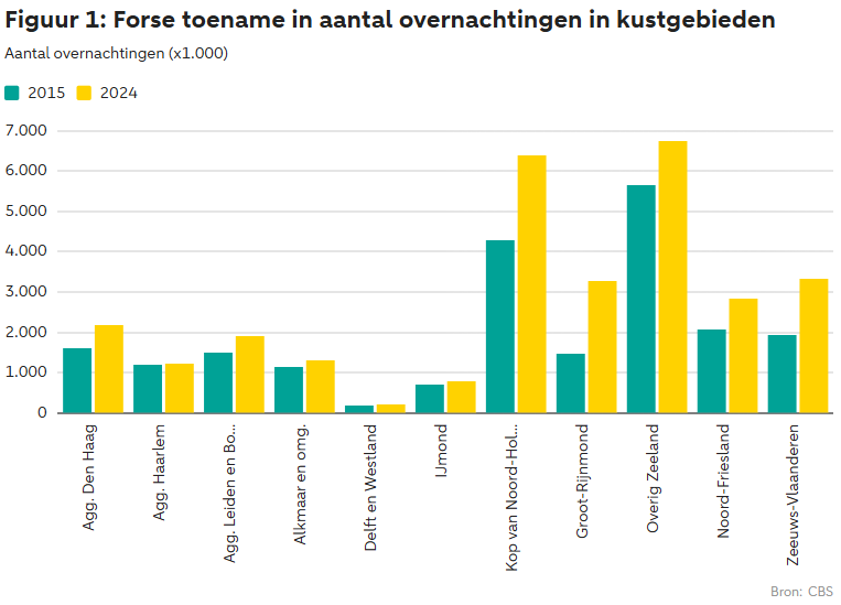 De Nederlandse kust staat er in 2024 beter voor dan tien jaar geleden en is uitgegroeid tot een motor van de toeristische sector. Het aantal overnachtingen in kustgemeenten steeg volgens het Centraal Bureau van de Statistiek (CBS) van 21,8 miljoen in 2014 naar 30,2 miljoen in 2024; een groei van 39 procent. Landelijk was de stijging vergelijkbaar, maar ook gestuwd door meer zakelijke reizen. De kust leunt juist op vakantiegangers en recreanten, wat de groei extra opvallend maakt.