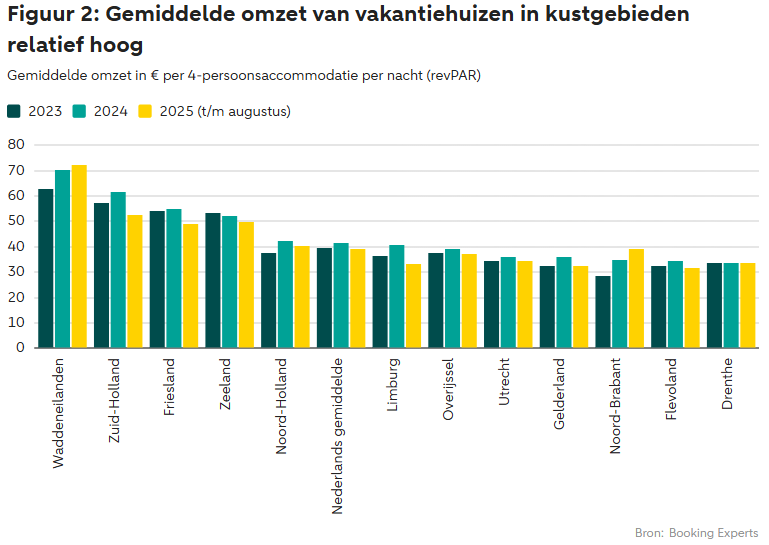 De Nederlandse kust behoort tot de duurdere bestemmingen. Uit gegevens van Booking Experts blijkt dat de omzet van een accommodatie voor vier personen op de Waddeneilanden gemiddeld 72 euro per nacht is. Dat is bijna het dubbele van het landelijk gemiddelde van 39 euro. Het prijsverschil weerspiegelt de positie van de kust als aantrekkelijke bestemming, waar de vraag groot genoeg is om hogere tarieven te hanteren.