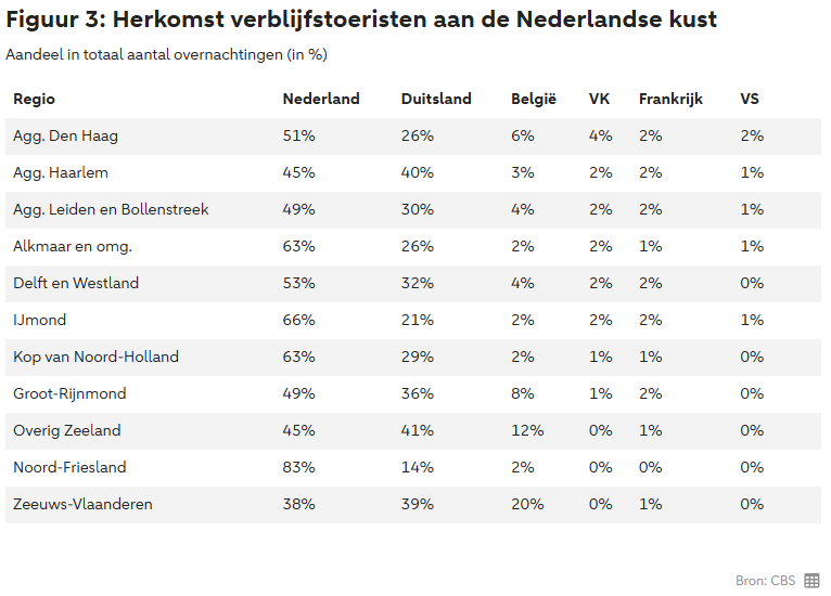 De Nederlandse kust leunt zwaar op vaste gasten. In regio’s als Noord-Friesland en de Kop van Noord-Holland zijn meer dan zes op de tien bezoekers Nederlanders. Duitsers vormen de belangrijkste buitenlandse gasten met 25 tot 40 procent van de overnachtingen, waarbij Zeeland en Zeeuws-Vlaanderen bovengemiddeld uitvallen. Belgen zijn er eveneens goed vertegenwoordigd: in Zeeuws-Vlaanderen goed voor een vijfde van alle overnachtingen.
