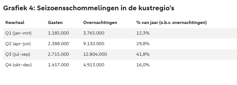 Voor de kustregio’s biedt dit kansen: juist in de herfst en winter zoeken 55-plussers comfort, natuur, gastronomie en wellness. En die extra gasten zijn hard nodig, want ruim twee derde van de overnachtingen vindt nu nog in het tweede en derde kwartaal plaats.