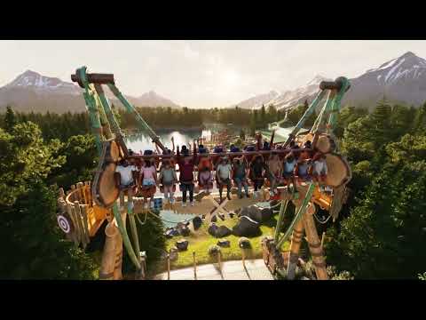 De attractie slingert bezoekers hoog boven de vijver en combineert een adrenalinemoment met een panoramisch uitzicht over het park.