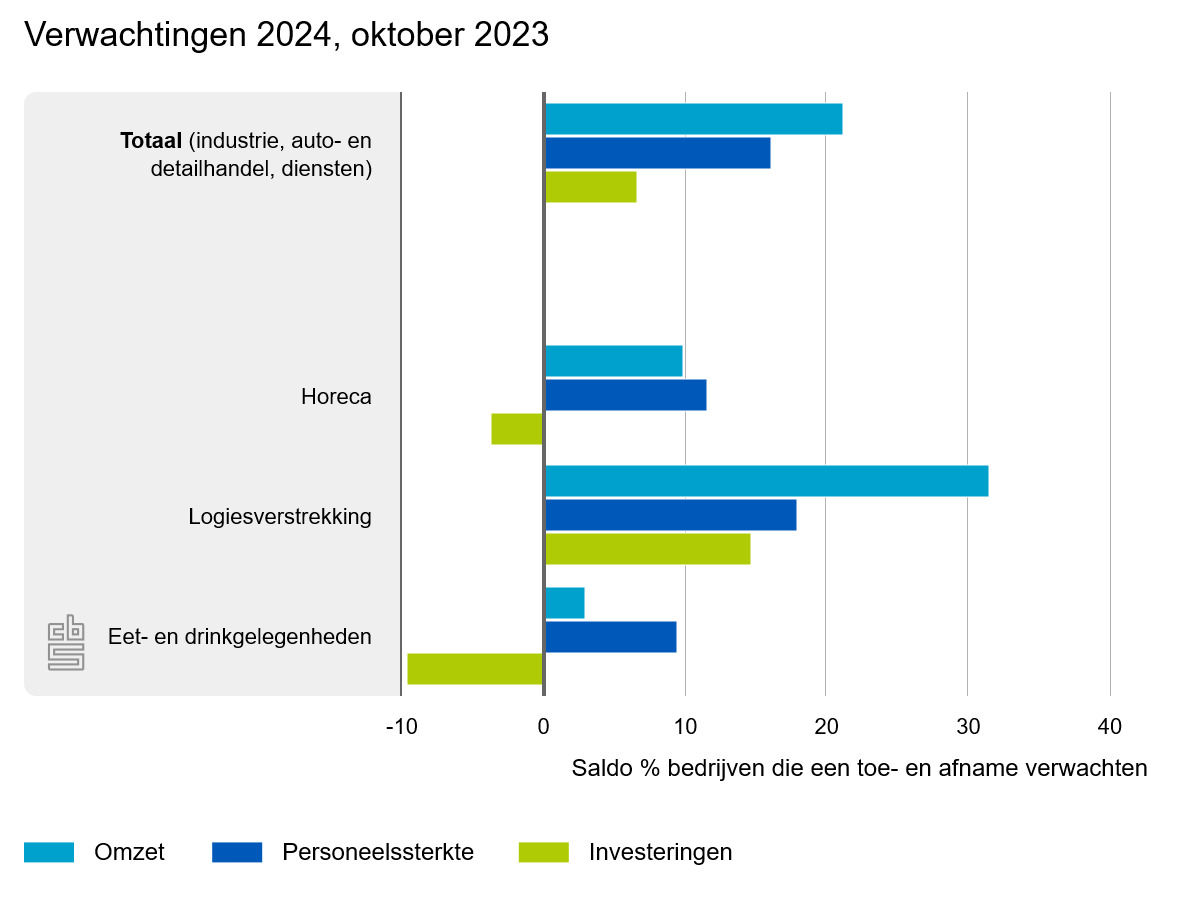 Ondernemers in de horeca zijn voor 2024 minder positief gestemd over de omzet, personeelssterkte en investeringen dan het gemiddelde van alle bedrijfstakken. Binnen de horeca komt dat vooral door de eet- en drinkgelegenheden, ondernemers in de logiesverstrekking zijn juist positiever gestemd dan gemiddeld. Per saldo verwacht 3 procent van de ondernemers in de eet- en drinkgelegenheden een stijging van de omzet in 2024 ten opzichte van 2023. Bij het gemiddelde van alle bedrijfstakken ligt het saldo op iets meer dan 21 procent. Ondernemers in de eet- en drinkgelegenheden verwachten een daling van de investeringen in 2024. Het saldo ligt daar op ruim -9 procent terwijl ondernemers gemiddeld genomen met een saldo van ruim 6 procent positief zijn over de investeringen.
